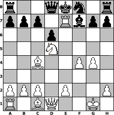 game notation in PGN-format [Event "Turnier zum Tag der deutschen Einheit 2015"] [Site "www.myChess.de"] [Date "2015.10.03"] [Round "2"] [White "ndziemba"] [Black "paul"] [ECO "C44"] [WhitemyELO "1407"] [BlackmyELO "1348"] [Result "1-0"] [TimeControl "10/1728000"] [WhiteDays "39"] [BlackDays "09"] [MyChessNo "100653"] 1. e4 e5 2. Nf3 Nc6 3. d4 Bd6 4. Nxe5 Bxe5 5. dxe5 Nxe5 6. f4 Ng6 7. Nc3 d6 8. Bc4 N8e7 9. O-O f5 10. Re1 Nf8 11. exf5 Bxf5 12. g4 Bg6 13. Nd5 Bf7 14. Rxe7+ 1-0 position notation in FEN-format r2qkn1r/ppp1Rbpp/3p4/3N4/2B2PP1/8/PPP1P2P/R1BQ2K1 - kq - 0 14 Captured white pieces: Captured black pieces: Click on a captured piece in order to display the desired move!