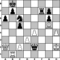 game notation in PGN-format [Event "MySchachOpen"] [Site "www.myChess.de"] [Date "2005.01.22"] [Round "1"] [White "Robur"] [Black "bjeu"] [ECO "C68"] [WhitemyELO "1655"] [BlackmyELO "1667"] [Result "0-1"] [TimeControl "10/2592000"] [WhiteDays "114"] [BlackDays "149"] [MyChessNo "9888"] 1. e4 e5 2. Nf3 Nc6 3. Bb5 a6 4. Bxc6 dxc6 5. O-O Bg4 6. h3 Bh5 7. g4 Bg6 8. Nxe5 Qe7 9. Nxg6 hxg6 10. Qf3 Qe5 11. Kg2 O-O-O 12. d3 Bd6 13. Rh1 Nf6 14. Nd2 Qe6 15. Nc4 Nd7 16. Bd2 Ne5 17. Nxd6+ cxd6 18. Qe3 Rde8 19. Qa7 Nd7 20. Qa8+ Nb8 21. b4 f5 22. f3 Ref8 23. Rhf1 fxg4 24. fxg4 Rxf1 25. Rxf1 Qxa2 26. Rc1 Rf8 27. Qa7 c5 28. bxc5 Qf7 29. Rb1 Qf2+ 30. Kh1 Rf7 31. Bg5 Qg3 32. h4 Qh3+ 33. Kg1 Qxg4+ 34. Kh1 Qh3+ 35. Kg1 Qg3+ 36. Kh1 Qf3+ 37. Kh2 Qf2+ 38. Kh1 dxc5 39. Qb6 Nc6 40. Qb3 Kb8 41. Qa2 Qf3+ 42. Kh2 Qe2+ 0-1 position notation in FEN-format 1k6/1p3rp1/p1n3p1/2p3B1/4P2P/3P4/Q1P1q2K/1R6 - - - 8 43 Captured white pieces: Captured black pieces: Click on a captured piece in order to display the desired move!