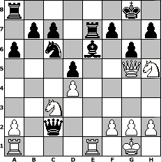game notation in PGN-format [Event "Alapin-Diemer-Gambit Thematurnier"] [Site "www.myChess.de"] [Date "2010.01.23"] [Round "1"] [White "bane"] [Black "Kloetzchenschieber"] [ECO "C01"] [WhitemyELO "1876"] [BlackmyELO "1758"] [Result "1/2-1/2"] [TimeControl "10/2592000"] [WhiteDays "49"] [BlackDays "49"] [MyChessNo "62577"] 1. e4 e6 2. d4 d5 3. Be3 dxe4 4. Ne2 Nf6 5. Ng3 Be7 6. Bc4 Nc6 7. Nc3 O-O 8. O-O Nd5 9. Ngxe4 a6 10. Bxd5 exd5 11. Ng3 Qd6 12. Qf3 Be6 13. Nh5 Rfe8 14. Rfe1 Qb4 15. Qg3 g6 16. Bg5 Qxb2 17. Bxe7 Rxe7 18. Nf6+ Kg7 19. Qg5 Qxc2 20. Nh5+ Kg8 1/2-1/2 position notation in FEN-format r5k1/1pp1rp1p/p1n1b1p1/3p2QN/3P4/2N5/P1q2PPP/R3R1K1 - - - 2 21 Captured white pieces: Captured black pieces: Click on a captured piece in order to display the desired move!