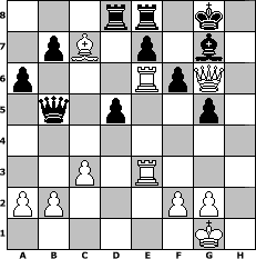game notation in PGN-format [Event "Wintereinbruch"] [Site "www.myChess.de"] [Date "2015.10.18"] [Round "1"] [White "Schefsche"] [Black "Seneca"] [ECO "B07"] [WhitemyELO "1512"] [BlackmyELO "1480"] [Result "1-0"] [TimeControl "10/1728000"] [WhiteDays "56"] [BlackDays "41"] [MyChessNo "100821"] 1. e4 d6 2. d4 Nf6 3. Nc3 g6 4. d5 Bg7 5. Bb5+ Bd7 6. Nf3 Bxb5 7. Nxb5 Nxe4 8. Qe2 Nc5 9. c3 a6 10. Nbd4 O-O 11. O-O c6 12. Bg5 f6 13. Bh4 Qd7 14. Rae1 Re8 15. Qc4 cxd5 16. Qxd5+ Kh8 17. Ne6 Nxe6 18. Rxe6 Nc6 19. Rfe1 Rad8 20. Nd4 Nxd4 21. Qxd4 g5 22. Bg3 d5 23. Qg4 h6 24. R1e3 Bf8 25. h4 Qb5 26. hxg5 hxg5 27. Qh5+ Kg8 28. Qg6+ Bg7 29. Bc7 1-0 position notation in FEN-format 3rr1k1/1pB1p1b1/p3RpQ1/1q1p2p1/8/2P1R3/PP3PP1/6K1 - - - 5 29 Captured white pieces: Captured black pieces: Click on a captured piece in order to display the desired move!