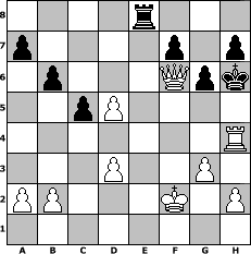 game notation in PGN-format [Event "Advents-Open 2011"] [Site "www.myChess.de"] [Date "2011.11.27"] [Round "1"] [White "haggard"] [Black "reisender"] [ECO "A10"] [WhitemyELO "1960"] [BlackmyELO "1451"] [Result "1-0"] [TimeControl "10/864000"] [WhiteDays "10"] [BlackDays "10"] [MyChessNo "77739"] 1. c4 g6 2. g3 Bg7 3. Bg2 Nf6 4. Nc3 O-O 5. e4 Nc6 6. Nge2 e5 7. O-O b6 8. d3 Bb7 9. f4 exf4 10. Nxf4 Nd4 11. Be3 c5 12. e5 Ng4 13. Qxg4 Bxg2 14. Nxg2 Nc2 15. Rac1 Nxe3 16. Nxe3 Bxe5 17. Rce1 d6 18. Rf2 Bd4 19. Kg2 Qe7 20. Ncd5 Qb7 21. Nf5 Bxf2 22. Kxf2 Qd7 23. Nh6+ Kg7 24. Qxd7 Kxh6 25. Qxd6 Rad8 26. Qf4+ Kg7 27. Qf6+ Kh6 28. Re4 Rxd5 29. cxd5 Re8 30. Rh4# 1-0 position notation in FEN-format 4r3/p4p1p/1p3Qpk/2pP4/7R/3P2P1/PP3K1P/8 - - - 2 30 Captured white pieces: ![]() ![]() ![]() ![]() ![]() ![]() ![]() ![]() ![]() ![]() ![]() ![]() ![]() ![]() ![]() Captured black pieces: ![]() ![]() ![]() ![]() ![]() ![]() ![]() ![]() ![]() ![]() ![]() ![]() ![]() ![]() ![]() Click on a captured piece in order to display the desired move!