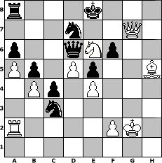 game notation in PGN-format [Event "Spanisch"] [Site "www.myChess.de"] [Date "2016.12.30"] [Round "1"] [White "sprinterde"] [Black "Joschi"] [ECO "C89"] [WhitemyELO "1705"] [BlackmyELO "1575"] [Result "1-0"] [TimeControl "10/1728000"] [WhiteDays "20"] [BlackDays "20"] [MyChessNo "106215"] 1. e4 e5 2. Nf3 Nc6 3. Bb5 a6 4. Ba4 Nf6 5. O-O Be7 6. Re1 b5 7. Bb3 O-O 8. c3 d6 9. h3 Na5 10. Bc2 c5 11. d4 Nc6 12. d5 Nb8 13. b3 Nbd7 14. Bg5 Bb7 15. Nbd2 Qc7 16. Nh4 h6 17. Nf5 Bd8 18. Bh4 Kh7 19. Rf1 g6 20. Ne3 Nh5 21. Bxd8 Qxd8 22. Nf5 Nf4 23. Nxd6 Qc7 24. Nxb7 Qxb7 25. Kh2 Qc7 26. g3 Nh5 27. Nf3 c4 28. b4 Nhf6 29. a4 Rfd8 30. Qd2 Nb6 31. Ra2 Kg7 32. Rfa1 Nfd7 33. Kg2 f6 34. g4 Kh7 35. h4 g5 36. hxg5 hxg5 37. Rh1+ Kg6 38. Rh5 Rh8 39. a5 Na4 40. Nxg5 Rxh5 41. Ne6 Qd6 42. gxh5+ Kxh5 43. Qe2+ Kg6 44. Qg4+ Kf7 45. Qg7+ Ke8 46. Bd1 Nxc3 47. Bh5# 1-0 position notation in FEN-format r3k3/3n2Q1/p2qNp2/Pp1Pp2B/1Pp1P3/2n5/R4PK1/8 - - - 1 47 Captured white pieces: ![]() ![]() ![]() ![]() ![]() ![]() ![]() ![]() ![]() ![]() ![]() ![]() ![]() ![]() ![]() Captured black pieces: ![]() ![]() ![]() ![]() ![]() ![]() ![]() ![]() ![]() ![]() ![]() ![]() ![]() ![]() ![]() Click on a captured piece in order to display the desired move!