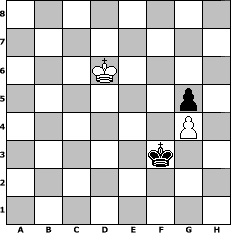 game notation in PGN-format [Event "Sommerschach"] [Site "www.myChess.de"] [Date "2018.05.26"] [Round "1"] [White "Gauss1233"] [Black "Naunhofer"] [ECO "?"] [WhitemyELO "1398"] [BlackmyELO "1602"] [Result "0-1"] [TimeControl "10/2592000"] [WhiteDays "30"] [BlackDays "30"] [MyChessNo "112208"] 1. d4 Nf6 2. c4 e6 3. Nc3 d5 4. cxd5 Nxd5 5. Bd2 c5 6. dxc5 Bxc5 7. e3 O-O 8. a3 a6 9. Nf3 b5 10. Nxd5 Qxd5 11. Be2 Bb7 12. Bc3 Qf5 13. Bd3 Qg4 14. O-O Rd8 15. h3 Bxf3 16. hxg4 Bxd1 17. Raxd1 Nd7 18. b4 Be7 19. Be4 Rac8 20. Ba1 Nf6 21. Bb7 Rb8 22. Rxd8+ Bxd8 23. Bxa6 Nxg4 24. Rc1 Ra8 25. Bxb5 Rxa3 26. Be2 Nh6 27. Bd4 Ra8 28. b5 Nf5 29. Ra1 Rxa1+ 30. Bxa1 f6 31. e4 Nd6 32. f3 Bb6+ 33. Kh2 Kf7 34. e5 Nf5 35. g4 Nh4 36. Kg3 g5 37. exf6 h6 38. Bc3 Ng6 39. Bd3 Nf8 40. f4 Bc7 41. Be5 Bd8 42. fxg5 hxg5 43. Kf3 Nd7 44. Ke4 Nxe5 45. Kxe5 Bxf6+ 46. Kd6 Bd4 47. Kc6 Kf6 48. b6 Ke5 49. b7 Ba7 50. Kc7 Kf4 51. Be2 e5 52. b8=Q Bxb8+ 53. Kxb8 e4 54. Kc7 Ke3 55. Bd1 Kd2 56. Ba4 e3 57. Bb5 e2 58. Bxe2 Kxe2 59. Kd6 Kf3 0-1 position notation in FEN-format 8/8/3K4/6p1/6P1/5k2/8/8 - - - 2 60 Captured white pieces: Captured black pieces: Click on a captured piece in order to display the desired move!