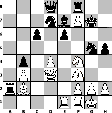 game notation in PGN-format [Event "Zum Vatertag"] [Site "www.myChess.de"] [Date "2017.05.27"] [Round "1"] [White "Cuibono"] [Black "Ziegert"] [ECO "A03"] [WhitemyELO "2185"] [BlackmyELO "1582"] [Result "1-0"] [TimeControl "10/2592000"] [WhiteDays "87"] [BlackDays "27"] [MyChessNo "108357"] 1. f4 d5 2. Nf3 Nf6 3. e3 Bf5 4. b3 e6 5. Bb2 h5 6. Bd3 Bxd3 7. cxd3 Be7 8. d4 O-O 9. O-O c6 10. Nc3 Nbd7 11. d3 g6 12. Qd2 b5 13. Rae1 a5 14. e4 a4 15. f5 axb3 16. fxg6 Kg7 17. axb3 b4 18. Ne2 dxe4 19. dxe4 Nxe4 20. Qd3 Ra2 21. Nf4 Ng5 22. gxf7 1-0 position notation in FEN-format 3q1r2/3nbPk1/2p1p3/6np/1p1P1N2/1P1Q1N2/rB3PPP/4RRK1 - - - 0 22 Captured white pieces: Captured black pieces: Click on a captured piece in order to display the desired move!