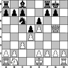 game notation in PGN-format [Event "Wrixum - Open die I."] [Site "www.myChess.de"] [Date "2004.12.11"] [Round "1"] [White "rikilatic"] [Black "Knight"] [ECO "C00"] [WhitemyELO "1563"] [BlackmyELO "1103"] [Result "1-0"] [TimeControl "10/2592000"] [WhiteDays "30"] [BlackDays "30"] [MyChessNo "8722"] 1. e4 e6 2. Qf3 Nc6 3. c3 Nf6 4. d4 d5 5. e5 Ne4 6. Bd3 Ng5 7. Bxg5 Be7 8. Bxe7 Qxe7 9. Nh3 O-O 10. Bxh7+ Kxh7 11. Qh5+ Kg8 12. Ng5 Qxg5 13. Qxg5 1-0 position notation in FEN-format r1b2rk1/ppp2pp1/2n1p3/3pP1Q1/3P4/2P5/PP2PPPP/RN2K2R - KQ - 0 13 Captured white pieces: Captured black pieces: Click on a captured piece in order to display the desired move!