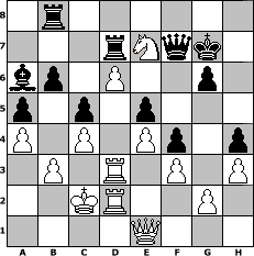 game notation in PGN-format [Event "In Memorium Michael Knopf"] [Site "www.myChess.de"] [Date "2012.04.10"] [Round "1"] [White "faustballer"] [Black "rux"] [ECO "D01"] [WhitemyELO "1513"] [BlackmyELO "1565"] [Result "1-0"] [TimeControl "10/2592000"] [WhiteDays "150"] [BlackDays "112"] [MyChessNo "81111"] 1. d4 d5 2. Nc3 Nf6 3. h3 Ne4 4. Nxe4 dxe4 5. e3 g6 6. b3 Bg7 7. Bb2 O-O 8. Ne2 c5 9. c3 Qc7 10. c4 Rd8 11. Rb1 a5 12. d5 Bxb2 13. Rxb2 Nc6 14. Qb1 Ne5 15. Nc3 f5 16. Be2 Nd3+ 17. Bxd3 exd3 18. Rd2 b6 19. Rxd3 e5 20. Nb5 Qb7 21. O-O f4 22. e4 Bd7 23. Nc3 Qb8 24. a4 Qd6 25. Qd1 Rf8 26. f3 Qf6 27. Kf2 Qh4+ 28. Ke2 Qg3 29. Rf2 h5 30. Qh1 h4 31. Kf1 Qg5 32. Ke1 Rad8 33. Rfd2 Qf6 34. Kd1 Bc8 35. Kc2 Ba6 36. d6 Qf7 37. Qd1 Rd7 38. Nd5 Rb8 39. Ne7+ Kg7 40. Qe1 1-0 position notation in FEN-format 1r6/3rNqk1/bp1P2p1/p1p1p3/P1P1Pp1p/1P1R1P1P/2KR2P1/4Q3 - - - 8 40 Captured white pieces: Captured black pieces: Click on a captured piece in order to display the desired move!