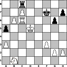 game notation in PGN-format [Event "°°°°``Der sch"] [Site "www.myChess.de"] [Date "2009.05.11"] [Round "1"] [White "murphy12"] [Black "ChrisKoenig"] [ECO "A00"] [WhitemyELO "1580"] [BlackmyELO "1545"] [Result "1-0"] [TimeControl "10/864000"] [WhiteDays "40"] [BlackDays "39"] [MyChessNo "55545"] 1. Nc3 f5 2. e4 fxe4 3. d3 Nf6 4. Bg5 e5 5. Bxf6 Qxf6 6. dxe4 Bb4 7. Nge2 O-O 8. f3 d6 9. Qd5+ Qe6 10. O-O-O c6 11. Qxe6+ Bxe6 12. a3 Bxc3 13. Nexc3 Rd8 14. Be2 d5 15. Bc4 Na6 16. exd5 Bf7 17. Bxa6 bxa6 18. dxc6 Rdc8 19. Rd6 Be8 20. Nd5 Kf7 21. c7 Bb5 22. b3 a5 23. c4 Be8 24. Re1 Kf8 25. Rxe5 Bf7 26. Rc6 Be8 27. Rf5+ Bf7 28. Kd2 Re8 29. Kd3 Rac8 30. b4 g6 31. Rxf7+ Kxf7 32. b5 Re6 33. c5 Re5 34. Kd4 Re1 35. b6 Rd1+ 36. Kc4 axb6 37. cxb6 Rxd5 38. Kxd5 1-0 position notation in FEN-format 2r5/2P2k1p/1PR3p1/p2K4/8/P4P2/6PP/1N6 - - - 0 38 Captured white pieces: ![]() ![]() ![]() ![]() ![]() ![]() ![]() ![]() ![]() ![]() ![]() ![]() ![]() ![]() ![]() Captured black pieces: ![]() ![]() ![]() ![]() ![]() ![]() ![]() ![]() ![]() ![]() ![]() ![]() ![]() ![]() ![]() Click on a captured piece in order to display the desired move!
