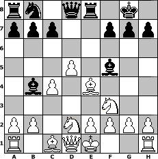 | game notation in PGN-format [Event "Skandinavisches Turnier"] [Site "www.myChess.de"] [Date "2013.05.06"] [Round "1"] [White "zidan"] [Black "Knight"] [ECO "B01"] [WhitemyELO "1293"] [BlackmyELO "1267"] [Result "0-1"] [TimeControl "10/2592000"] [WhiteDays "00"] [BlackDays "60"] [MyChessNo "88174"] 1. e4 d5 2. exd5 Nf6 3. c4 e6 4. dxe6 Bxe6 5. Nf3 Bc5 6. d4 Bb4+ 7. Nbd2 Ne4 8. d5 Bf5 9. Bd3 O-O 10. Bxe4 Re8 0-1 position notation in FEN-format rn1qr1k1/ppp2ppp/8/3P1b2/1bP1B3/5N2/PP1NPPPP/R1BQK2R - KQ - 1 11 Captured white pieces:                              Captured black pieces:                               Click on a captured piece in order to display the desired move!