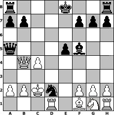 game notation in PGN-format [Event "4. Windeck Open"] [Site "www.myChess.de"] [Date "2011.06.29"] [Round "1"] [White "sprinterde"] [Black "Jolilein"] [ECO "E30"] [WhitemyELO "1679"] [BlackmyELO "1882"] [Result "0-1"] [TimeControl "10/864000"] [WhiteDays "20"] [BlackDays "20"] [MyChessNo "74825"] 1. d4 Nf6 2. c4 e6 3. Nc3 Bb4 4. Bg5 c5 5. dxc5 Na6 6. Qd4 Nxc5 7. Bd2 d6 8. O-O-O Qa5 9. Kc2 e5 10. Qxd6 Bf5+ 11. e4 Ncxe4 12. Nxe4 Nxe4 13. Qxb4 Nxd2+ 0-1 position notation in FEN-format r3k2r/pp3ppp/8/q3pb2/1QP5/8/PPKn1PPP/3R1BNR - kq - 0 14 Captured white pieces: Captured black pieces: Click on a captured piece in order to display the desired move!