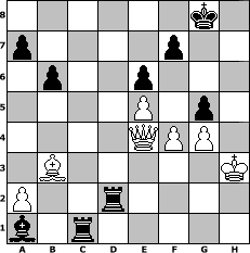 game notation in PGN-format [Event "II. Intergalaktische Meisterschaft"] [Site "www.myChess.de"] [Date "2008.09.08"] [Round "1"] [White "werderfan"] [Black "richym3"] [ECO "D85"] [WhitemyELO "1573"] [BlackmyELO "1802"] [Result "0-1"] [TimeControl "10/2592000"] [WhiteDays "30"] [BlackDays "24"] [MyChessNo "47827"] 1. d4 Nf6 2. c4 g6 3. Nc3 d5 4. cxd5 Nxd5 5. e4 Nxc3 6. bxc3 Bg7 7. Bb5+ c6 8. Bc4 c5 9. Nf3 O-O 10. O-O cxd4 11. cxd4 Nc6 12. Bb2 Bg4 13. Qb3 Bxf3 14. Qxf3 Nxd4 15. Bxd4 Qxd4 16. Bb3 Qxa1 17. Rxa1 Bxa1 18. h4 e6 19. h5 Rfc8 20. g4 Rc5 21. hxg6 hxg6 22. e5 Rb8 23. Qe3 b6 24. f4 Rd8 25. Qe4 Rc1+ 26. Kg2 Rd2+ 27. Kh3 g5 0-1 position notation in FEN-format 6k1/p4p2/1p2p3/4P1p1/4QPP1/1B5K/P2r4/b1r5 - - - 0 28 Captured white pieces: Captured black pieces: Click on a captured piece in order to display the desired move!