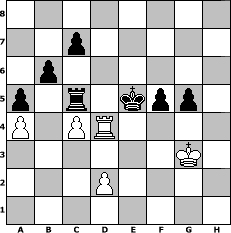 | game notation in PGN-format [Event "Winterturnier"] [Site "www.myChess.de"] [Date "2009.11.12"] [Round "1"] [White "Gauss1233"] [Black "sprinterde"] [ECO "D20"] [WhitemyELO "1389"] [BlackmyELO "1558"] [Result "0-1"] [TimeControl "10/3456000"] [WhiteDays "138"] [BlackDays "158"] [MyChessNo "60555"] 1. d4 d5 2. c4 dxc4 3. e4 e5 4. d5 Nf6 5. Nc3 Bb4 6. Qa4+ Nc6 7. dxc6 Bxc3+ 8. bxc3 b6 9. Bg5 h6 10. Bxf6 Qxf6 11. Qxc4 O-O 12. Nf3 Rd8 13. Be2 a5 14. O-O Ba6 15. Qb3 Bxe2 16. Rfe1 Bxf3 17. gxf3 Qxf3 18. c4 Rd3 19. Qc2 Rad8 20. Qe2 Qxe2 21. Rxe2 Rd1+ 22. Rxd1 Rxd1+ 23. Kg2 Rd4 24. Rc2 Rxe4 25. f3 Rd4 26. Kg3 Rd6 27. Re2 f6 28. f4 exf4+ 29. Kxf4 Rxc6 30. Re4 Kf7 31. h4 g5+ 32. hxg5 hxg5+ 33. Kg4 Rc5 34. Rd4 Kg6 35. a4 f5+ 36. Kf3 Kf6 37. Kg3 Ke5 0-1 position notation in FEN-format 8/2p5/1p6/p1r1kpp1/P1PR4/6K1/3P4/8 - - - 4 38 Captured white pieces:                              Captured black pieces:                               Click on a captured piece in order to display the desired move!
