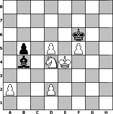 game notation in PGN-format [Event "Nach dem Weltuntergang 2012"] [Site "www.myChess.de"] [Date "2012.12.27"] [Round "1"] [White "Naunhofer"] [Black "Joschi"] [ECO "A56"] [WhitemyELO "1681"] [BlackmyELO "1562"] [Result "1-0"] [TimeControl "10/864000"] [WhiteDays "10"] [BlackDays "10"] [MyChessNo "85698"] 1. d4 Nf6 2. c4 c5 3. e3 cxd4 4. exd4 d5 5. Nf3 g6 6. Nc3 Bg7 7. Be3 O-O 8. Be2 dxc4 9. Bxc4 e6 10. O-O a6 11. Ne5 b5 12. Be2 Bb7 13. Bf3 Bxf3 14. Qxf3 Nbd7 15. Rad1 Nb6 16. b3 Nbd5 17. Nxd5 Nxd5 18. Nc6 Qc7 19. Rc1 Nxe3 20. fxe3 Qd6 21. Rc2 Rac8 22. Rfc1 Rc7 23. Rc5 Rfc8 24. b4 Bf8 25. Ne5 Qe7 26. h3 f6 27. Rxc7 Rxc7 28. Rxc7 Qxc7 29. Qxf6 Qe7 30. Qf3 Bg7 31. Qa8+ Bf8 32. Qxa6 Qxb4 33. Qxe6+ Kg7 34. Qf7+ Kh6 35. Qf2 Be7 36. h4 Qb1+ 37. Kh2 Qe4 38. g4 Bd6 39. Qf4+ Qxf4+ 40. exf4 Kg7 41. Kg3 Kf6 42. Kf3 h5 43. gxh5 gxh5 44. Ke4 Ke6 45. f5+ Kf6 46. Ng6 Bg3 47. Nf4 Bxh4 48. Nxh5+ Kg5 49. Ng7 Kf6 50. Ne6 Be1 51. d5 Bb4 52. Nd4 1-0 position notation in FEN-format 8/8/5k2/1p1P1P2/1b1NK3/8/P2P4/8 - - - 2 52 Captured white pieces: Captured black pieces: Click on a captured piece in order to display the desired move!