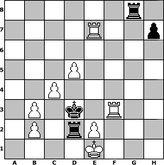 game notation in PGN-format [Event "Jahreswechsel"] [Site "www.myChess.de"] [Date "2009.12.30"] [Round "1"] [White "Andreas"] [Black "neve"] [ECO "B55"] [WhitemyELO "1506"] [BlackmyELO "1429"] [Result "1-0"] [TimeControl "10/1728000"] [WhiteDays "72"] [BlackDays "80"] [MyChessNo "61913"] 1. e4 c5 2. Nf3 d6 3. d4 cxd4 4. Nxd4 Nf6 5. Bd3 a6 6. O-O e5 7. Nb3 Be6 8. Nc3 Be7 9. f4 Bxb3 10. axb3 Nbd7 11. Qf3 Nb6 12. fxe5 dxe5 13. Qg3 Qc7 14. Qxg7 Rg8 15. Qh6 Rg6 16. Qh3 Qd7 17. Qxd7+ Kxd7 18. Be3 Bd8 19. Nd5 Nbxd5 20. exd5 e4 21. Bxe4 Nxe4 22. Rxf7+ Kd6 23. Rxb7 Bg5 24. Bxg5 Rxg5 25. c4 Rag8 26. Rxa6+ Ke5 27. Re7+ Kd4 28. g3 Nxg3 29. hxg3 Rxg3+ 30. Kf2 Rg2+ 31. Kf3 R2g3+ 32. Kf4 R3g4+ 33. Kf3 Rg3+ 34. Kf2 Rg2+ 35. Ke1 Kd3 36. Rf6 Rd2 37. Rf3+ 1-0 position notation in FEN-format 6r1/4R2p/8/3P4/2P5/1P1k1R2/1P1rP3/4K3 - - - 15 37 Captured white pieces: Captured black pieces: Click on a captured piece in order to display the desired move!