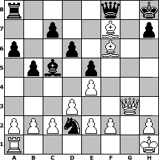 game notation in PGN-format [Event "Ja, is denn heut scho Weihnachten?"] [Site "www.myChess.de"] [Date "2014.12.06"] [Round "1"] [White "Knight"] [Black "Mattheus"] [ECO "C77"] [WhitemyELO "1316"] [BlackmyELO "1295"] [Result "1-0"] [TimeControl "10/2592000"] [WhiteDays "60"] [BlackDays "60"] [MyChessNo "97019"] 1. e4 e5 2. Nf3 Nc6 3. Bb5 a6 4. Ba4 Nf6 5. Nc3 Bc5 6. O-O O-O 7. d3 b5 8. Bb3 d6 9. Bg5 Nd4 10. Nd5 Bg4 11. Nxf6+ gxf6 12. Bh4 Bxf3 13. gxf3 Kh8 14. Kh1 Rg8 15. Rg1 Rxg1+ 16. Qxg1 Nxf3 17. Qg3 Nd2 18. Bxf7 Qf8 19. Bxf6+ 1-0 position notation in FEN-format r4q1k/2p2B1p/p2p1B2/1pb1p3/4P3/3P2Q1/PPPnPP1P/R6K - - - 0 19 Captured white pieces: ![]() ![]() ![]() ![]() ![]() ![]() ![]() ![]() ![]() ![]() ![]() ![]() ![]() ![]() ![]() Captured black pieces: ![]() ![]() ![]() ![]() ![]() ![]() ![]() ![]() ![]() ![]() ![]() ![]() ![]() ![]() ![]() Click on a captured piece in order to display the desired move!