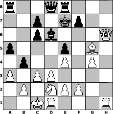 game notation in PGN-format [Event "Dabei ist alles 10"] [Site "www.myChess.de"] [Date "2010.09.12"] [Round "1"] [White "Zargoz"] [Black "Knight"] [ECO "C44"] [WhitemyELO "1411"] [BlackmyELO "1181"] [Result "1-0"] [TimeControl "10/864000"] [WhiteDays "02"] [BlackDays "10"] [MyChessNo "68302"] 1. e4 e5 2. Nf3 Nc6 3. c3 Nf6 4. Bb5 Bd6 5. Bxc6 dxc6 6. d3 Bg4 7. h3 Bxf3 8. Qxf3 O-O 9. Be3 Re8 10. Nd2 b5 11. g4 h6 12. a3 g5 13. O-O-O a5 14. h4 Nh7 15. hxg5 hxg5 16. Qf5 b4 17. Qxh7+ Kf8 18. Qh6+ Ke7 19. Bxg5+ 1-0 position notation in FEN-format r2qr3/2p1kp2/2pb3Q/p3p1B1/1p2P1P1/P1PP4/1P1NPP2/2KR3R - - - 0 19 Captured white pieces: Captured black pieces: Click on a captured piece in order to display the desired move!