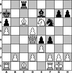 game notation in PGN-format [Event "Turnier f"] [Site "www.myChess.de"] [Date "2008.08.21"] [Round "1"] [White "andreas007"] [Black "stierdame1965"] [ECO "D20"] [WhitemyELO "1385"] [BlackmyELO "968"] [Result "1-0"] [TimeControl "10/2592000"] [WhiteDays "90"] [BlackDays "71"] [MyChessNo "47272"] 1. d4 d5 2. c4 dxc4 3. Nc3 f6 4. e3 a6 5. Bxc4 b5 6. Bd5 b4 7. Bxa8 Be6 8. Ne4 f5 9. Nc5 c6 10. Nxe6 Qd6 11. Nc5 e5 12. Nf3 Nd7 13. Nxd7 Qxd7 14. O-O e4 15. Ne5 Qd8 16. Bxc6+ Ke7 17. Qa4 Nf6 18. Qxb4+ Ke6 19. Qc4+ Kd6 20. Nf7+ Kc7 21. Nxd8 Be7 22. Ne6+ Kb6 23. d5 Rc8 24. a4 f4 25. a5+ Ka7 26. Qd4+ 1-0 position notation in FEN-format 2r5/k3b1pp/p1B1Nn2/P2P4/3Qpp2/4P3/1P1P1PPP/R1B2RK1 - - - 2 26 Captured white pieces: ![]() ![]() ![]() ![]() ![]() ![]() ![]() ![]() ![]() ![]() ![]() ![]() ![]() ![]() ![]() Captured black pieces: ![]() ![]() ![]() ![]() ![]() ![]() ![]() ![]() ![]() ![]() ![]() ![]() ![]() ![]() ![]() Click on a captured piece in order to display the desired move!