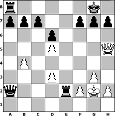 game notation in PGN-format [Event "Gegen die Herbstdepression"] [Site "www.myChess.de"] [Date "2008.12.01"] [Round "2"] [White "babikar"] [Black "ujack1961"] [ECO "B07"] [WhitemyELO "1376"] [BlackmyELO "1622"] [Result "0-1"] [TimeControl "10/864000"] [WhiteDays "10"] [BlackDays "10"] [MyChessNo "50385"] 1. e4 d6 2. Nf3 e5 3. Bc4 Be7 4. O-O Nf6 5. d3 O-O 6. Bg5 Be6 7. Nc3 Bxc4 8. b3 Be6 9. Bxf6 Bxf6 10. Nd5 Bxd5 11. exd5 e4 12. Re1 exf3 13. Qxf3 Bxa1 14. Rxa1 Re8 15. g3 Nd7 16. Kf1 Qf6 17. Qg4 Ne5 18. Qh5 Nxd3 19. cxd3 Qxa1+ 20. Kg2 Qxa2 21. b4 Re2 0-1 position notation in FEN-format r5k1/ppp2ppp/3p4/3P3Q/1P6/3P2P1/q3rPKP/8 - - - 1 22 Captured white pieces: ![]() ![]() ![]() ![]() ![]() ![]() ![]() ![]() ![]() ![]() ![]() ![]() ![]() ![]() ![]() Captured black pieces: ![]() ![]() ![]() ![]() ![]() ![]() ![]() ![]() ![]() ![]() ![]() ![]() ![]() ![]() ![]() Click on a captured piece in order to display the desired move!