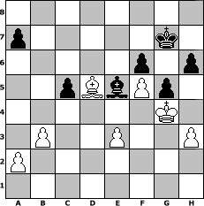 game notation in PGN-format [Event "Wrixum - Open die I."] [Site "www.myChess.de"] [Date "2004.12.11"] [Round "1"] [White "bjeu"] [Black "Robur"] [ECO "B02"] [WhitemyELO "1510"] [BlackmyELO "1641"] [Result "1/2-1/2"] [TimeControl "10/2592000"] [WhiteDays "30"] [BlackDays "30"] [MyChessNo "8716"] 1. e4 Nf6 2. e5 Nd5 3. c4 Nb6 4. d4 d6 5. Nf3 Bg4 6. Be2 Nc6 7. exd6 exd6 8. d5 Bxf3 9. gxf3 Ne5 10. f4 Ng6 11. Be3 Be7 12. Nc3 Nh4 13. Qc2 Ng2+ 14. Kd2 Nxe3 15. fxe3 O-O 16. Rad1 Bh4 17. Rdf1 c6 18. dxc6 bxc6 19. Kc1 Qe7 20. Qe4 Qxe4 21. Nxe4 d5 22. Nd6 dxc4 23. Nxc4 Nxc4 24. Bxc4 Rfe8 25. Rf3 Rad8 26. Rd1 g6 27. b3 Kg7 28. f5 Rxd1+ 29. Kxd1 Rd8+ 30. Ke2 Rd7 31. Bd3 Bf6 32. Rf1 Re7 33. Kf3 Rd7 34. Be4 Rd2 35. Rf2 Rxf2+ 36. Kxf2 c5 37. Kf3 g5 38. Kg4 h6 39. Bd5 Be5 40. h3 f6 1/2-1/2 position notation in FEN-format 8/p5k1/5p1p/2pBbPp1/6K1/1P2P2P/P7/8 - - - 0 41 Captured white pieces: Captured black pieces: Click on a captured piece in order to display the desired move!