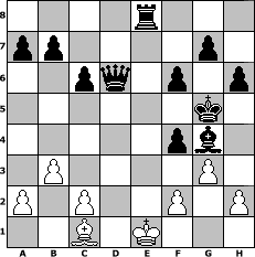 game notation in PGN-format [Event "Kellertunier"] [Site "www.myChess.de"] [Date "2005.08.15"] [Round "2"] [White "Pocket"] [Black "Andylein1989"] [ECO "A03"] [WhitemyELO "1282"] [BlackmyELO "1414"] [Result "0-1"] [TimeControl "10/864000"] [WhiteDays "10"] [BlackDays "10"] [MyChessNo "16268"] 1. f4 d5 2. Nf3 Nc6 3. e3 d4 4. Bd3 dxe3 5. dxe3 Nf6 6. b3 e6 7. Bb2 Bb4+ 8. Nbd2 O-O 9. O-O Bxd2 10. Qxd2 Re8 11. Qe2 Nb4 12. Rfd1 Nxd3 13. Rxd3 Qe7 14. Rad1 h6 15. Ne5 Nd5 16. Qg4 f6 17. Ng6 Qf7 18. f5 exf5 19. Qg3 Rxe3 20. Rxe3 Nxe3 21. Qxe3 Qxg6 22. Rd8+ Kh7 23. Qe7 c6 24. Qf8 Qg5 25. Qh8+ Kg6 26. Rd6 Qe3+ 27. Kf1 Qf4+ 28. Ke2 Qxd6 29. Qe8+ Kg5 30. Bc1+ f4 31. g3 Bg4+ 32. Ke1 Rxe8+ 0-1 position notation in FEN-format 4r3/pp4p1/2pq1p1p/6k1/5pb1/1P4P1/P1P2P1P/2B1K3 - - - 0 33 Captured white pieces: ![]() ![]() ![]() ![]() ![]() ![]() ![]() ![]() ![]() ![]() ![]() ![]() ![]() ![]() ![]() Captured black pieces: ![]() ![]() ![]() ![]() ![]() ![]() ![]() ![]() ![]() ![]() ![]() ![]() ![]() ![]() ![]() Click on a captured piece in order to display the desired move!