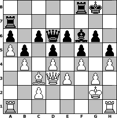 game notation in PGN-format [Event "Winter 19/20"] [Site "www.myChess.de"] [Date "2020.01.09"] [Round "2"] [White "lotchi"] [Black "hape50"] [ECO "D02"] [WhitemyELO "1308"] [BlackmyELO "1266"] [Result "1/2-1/2"] [TimeControl "10/2592000"] [WhiteDays "88"] [BlackDays "79"] [MyChessNo "116929"] 1. d4 d5 2. Nf3 h6 3. Nc3 e6 4. e3 Nf6 5. Bb5+ c6 6. Bd3 Bb4 7. a3 Be7 8. O-O O-O 9. Ne5 Nh7 10. Bxh7+ Kxh7 11. f4 Nd7 12. Bd2 b5 13. Nxd7 Bxd7 14. g3 Bf6 15. Be1 g6 16. b4 Bg7 17. Ne2 f5 18. Bc3 Qe7 19. Nc1 Bf6 20. a4 a6 21. a5 Kg8 22. Nb3 h5 23. Nc5 Qd6 24. Nxd7 Qxd7 25. h4 Qe7 26. Kg2 Qd6 27. Rh1 Ra7 28. Qd3 1/2-1/2 position notation in FEN-format 5rk1/r7/p1pqpbp1/Pp1p1p1p/1P1P1P1P/2BQP1P1/2P3K1/R6R - - - 6 28 Captured white pieces: Captured black pieces: Click on a captured piece in order to display the desired move!