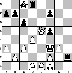 game notation in PGN-format [Event "RDK-Open 2008"] [Site "www.myChess.de"] [Date "2008.08.01"] [Round "1"] [White "Joschi"] [Black "Fighter"] [ECO "B01"] [WhitemyELO "1523"] [BlackmyELO "2055"] [Result "0-1"] [TimeControl "10/1728000"] [WhiteDays "19"] [BlackDays "19"] [MyChessNo "46727"] 1. e4 d5 2. exd5 Qxd5 3. Nc3 Qa5 4. d4 c6 5. Bd2 Nf6 6. Nf3 Bf5 7. Be2 e6 8. O-O Qc7 9. Ne5 Nbd7 10. Bf4 Bd6 11. Nxd7 Bxf4 12. Nxf6+ gxf6 13. g3 Bh3 14. Re1 O-O-O 15. Bf1 Bxf1 16. Kxf1 Be5 17. Ne2 h5 18. c3 Bd6 19. Qc2 h4 20. Rad1 hxg3 21. hxg3 Rh2 22. Qe4 Qa5 23. a3 Qh5 24. Nf4 Bxf4 25. Qxf4 e5 26. Qe3 f5 27. Qxe5 Qf3 0-1 position notation in FEN-format 2kr4/pp3p2/2p5/4Qp2/3P4/P1P2qP1/1P3P1r/3RRK2 - - - 1 28 Captured white pieces: Captured black pieces: Click on a captured piece in order to display the desired move!