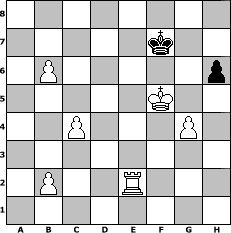 game notation in PGN-format [Event "Herbstturnier 2"] [Site "www.myChess.de"] [Date "2011.10.05"] [Round "1"] [White "Achimkogge"] [Black "alpacino"] [ECO "C22"] [WhitemyELO "1381"] [BlackmyELO "1285"] [Result "1-0"] [TimeControl "10/1728000"] [WhiteDays "20"] [BlackDays "20"] [MyChessNo "76602"] 1. e4 e5 2. d4 exd4 3. Qxd4 c5 4. Qe5+ Qe7 5. Qxe7+ Bxe7 6. Nf3 Nf6 7. Bc4 O-O 8. e5 Ne4 9. Bd5 Nd6 10. exd6 Bxd6 11. O-O Na6 12. Re1 Nb4 13. Bb3 b6 14. Na3 a6 15. Ng5 b5 16. Nxf7 Bc7 17. Nd6+ Kh8 18. Nf7+ Kg8 19. Nh6+ Kh8 20. Nf7+ Kg8 21. Nd6+ Kh8 22. Nxc8 Raxc8 23. Bd2 c4 24. Bxb4 cxb3 25. Bxf8 Rxf8 26. axb3 Bb6 27. Re2 b4 28. Nc4 Bc5 29. Rxa6 d6 30. Nxd6 Bxd6 31. Rxd6 h6 32. h4 Kh7 33. g4 Rf4 34. f3 Rxf3 35. Kg2 Rf4 36. Kg3 Rf1 37. Rb6 Rg1+ 38. Kf3 Rf1+ 39. Rf2 Rh1 40. h5 Rh3+ 41. Kf4 Rh1 42. Rxb4 Rb1 43. c3 Rd1 44. Rb6 g5+ 45. hxg6+ Kg7 46. b4 Rd7 47. Re2 Kf8 48. Kf5 Kg7 49. c4 Rc7 50. Rf6 Rb7 51. b5 Rc7 52. Rf7+ Rxf7+ 53. gxf7 Kxf7 54. b6 1-0 position notation in FEN-format 8/5k2/1P5p/5K2/2P3P1/8/1P2R3/8 - - - 0 54 Captured white pieces: Captured black pieces: Click on a captured piece in order to display the desired move!