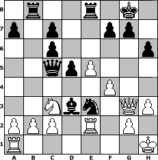 game notation in PGN-format [Event "Drei Pferde zu Weihnachten"] [Site "www.myChess.de"] [Date "2009.12.20"] [Round "1"] [White "rkoelbach"] [Black "rakl"] [ECO "C47"] [WhitemyELO "1484"] [BlackmyELO "1849"] [Result "0-1"] [TimeControl "10/864000"] [WhiteDays "00"] [BlackDays "14"] [MyChessNo "61714"] 1. e4 e5 2. Nf3 Nc6 3. Nc3 Nf6 4. d4 exd4 5. Nxd4 Bb4 6. Nxc6 bxc6 7. Bd3 O-O 8. O-O Re8 9. Bg5 h6 10. Bh4 Be7 11. f4 d5 12. e5 Ng4 13. Bxe7 Qxe7 14. Qf3 Qc5+ 15. Kh1 Ne3 16. Rf2 Bg4 17. Qg3 Rab8 18. h3 Bf5 19. Re2 Bxd3 0-1 position notation in FEN-format 1r2r1k1/p1p2pp1/2p4p/2qpP3/5P2/2Nbn1QP/PPP1R1P1/R6K - - - 0 20 Captured white pieces: Captured black pieces: Click on a captured piece in order to display the desired move!