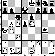 game notation in PGN-format [Event "3. HSF-Clubturnier 2012/13; Gruppe A"] [Site "www.myChess.de"] [Date "2012.09.01"] [Round "1"] [White "jeremyt"] [Black "Duschgel"] [ECO "B12"] [WhitemyELO "2021"] [BlackmyELO "1594"] [Result "1-0"] [TimeControl "10/2592000"] [WhiteDays "30"] [BlackDays "30"] [MyChessNo "83624"] 1. e4 c6 2. d4 d5 3. e5 c5 4. dxc5 Nc6 5. Nf3 Bg4 6. c3 e6 7. b4 Nxe5 8. Qa4+ Qd7 9. Bb5 Nc6 10. Ne5 1-0 position notation in FEN-format r3kbnr/pp1q1ppp/2n1p3/1BPpN3/QP4b1/2P5/P3PPPP/RNB1K2R - KQkq - 5 10 Captured white pieces: Captured black pieces: Click on a captured piece in order to display the desired move!