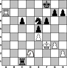 game notation in PGN-format [Event "RLT Robur +/-100"] [Site "www.myChess.de"] [Date "2005.03.25"] [Round "2"] [White "Zoltan"] [Black "NoBody"] [ECO "A42"] [WhitemyELO "1693"] [BlackmyELO "1782"] [Result "0-1"] [TimeControl "10/2592000"] [WhiteDays "113"] [BlackDays "090"] [MyChessNo "11514"] 1. d4 d6 2. c4 e5 3. dxe5 dxe5 4. Qxd8+ Kxd8 5. Nf3 f6 6. Nc3 Be6 7. e4 c6 8. Be3 Nd7 9. a3 Ne7 10. c5 Ng6 11. b4 a5 12. Rc1 axb4 13. axb4 b6 14. Nd2 bxc5 15. bxc5 Bxc5 16. Bxc5 Nxc5 17. Ncb1 Ra5 18. Bc4 Ke7 19. O-O Nf4 20. g3 Bxc4 21. Rxc4 Nfd3 22. Rc3 Rb8 23. Rd1 Ra2 24. Ra3 Nxf2 25. Kxf2 Rxb1 26. Rxa2 Rxd1 27. Ra7+ Kf8 28. Ke3 Rc1 29. Kf3 Ne6 0-1 position notation in FEN-format 5k2/R5pp/2p1np2/4p3/4P3/5KP1/3N3P/2r5 - - - 6 30 Captured white pieces: Captured black pieces: Click on a captured piece in order to display the desired move!