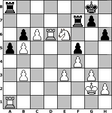 | game notation in PGN-format [Event "TM7E - E00 - Katalanische Er"] [Site "www.myChess.de"] [Date "2013.01.24"] [Round "1"] [White "sprinterde"] [Black "Teresa"] [ECO "E00"] [WhitemyELO "1692"] [BlackmyELO "1560"] [Result "1-0"] [TimeControl "10/2592000"] [WhiteDays "30"] [BlackDays "27"] [MyChessNo "86268"] 1. d4 Nf6 2. c4 e6 3. g3 d5 4. e3 Nc6 5. c5 b6 6. Bb5 Bb7 7. Qa4 Qd7 8. Nf3 a6 9. Bxc6 Qxc6 10. Qxc6+ Bxc6 11. Ne5 Bb5 12. a4 Bd7 13. c6 Bc8 14. O-O a5 15. Nc3 Ba6 16. Rd1 Bb4 17. Nb5 Bxb5 18. axb5 O-O 19. f3 Rfd8 20. Nd3 Bf8 21. Nf4 Ne8 22. Ne2 f5 23. Rd3 Bb4 24. Bd2 Bxd2 25. Rxd2 Nd6 26. Nc3 h6 27. b3 Re8 28. Kg2 e5 29. dxe5 Rxe5 30. f4 Re7 31. Nxd5 Rf7 32. Nxc7 Rd8 33. Ne6 Ra8 34. Rxd6 1-0 position notation in FEN-format r5k1/5rp1/1pPRN2p/pP3p2/5P2/1P2P1P1/6KP/R7 - - - 0 34 Captured white pieces: Captured black pieces: Click on a captured piece in order to display the desired move!