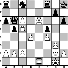 game notation in PGN-format [Event "Sommer bis Herbst"] [Site "www.myChess.de"] [Date "2015.07.25"] [Round "1"] [White "Duschgel"] [Black "lotchi"] [ECO "A15"] [WhitemyELO "1458"] [BlackmyELO "1275"] [Result "1-0"] [TimeControl "10/1728000"] [WhiteDays "21"] [BlackDays "00"] [MyChessNo "99834"] 1. c4 Nf6 2. g3 Nc6 3. Bg2 e5 4. Nc3 Bb4 5. e3 O-O 6. Nge2 Bxc3 7. Nxc3 d6 8. O-O Be6 9. Nd5 a6 10. f4 Bxd5 11. cxd5 Ne7 12. Qb3 b5 13. d4 exd4 14. exd4 Qd7 15. Bd2 h6 16. Rac1 c6 17. dxc6 Qc7 18. Qa3 Nfd5 19. Ba5 Nb6 20. Rfe1 f5 21. Bxb6 Qxb6 22. Qxd6 Nc8 23. Qe6+ Kh8 24. Rc5 1-0 position notation in FEN-format r1n2r1k/6p1/pqP1Q2p/1pR2p2/3P1P2/6P1/PPP3BP/4R1K1 - - - 4 24 Captured white pieces: ![]() ![]() ![]() ![]() ![]() ![]() ![]() ![]() ![]() ![]() ![]() ![]() ![]() ![]() ![]() Captured black pieces: ![]() ![]() ![]() ![]() ![]() ![]() ![]() ![]() ![]() ![]() ![]() ![]() ![]() ![]() ![]() Click on a captured piece in order to display the desired move!