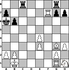 game notation in PGN-format [Event "Chess960 Open I 2014"] [Site "www.myChess.de"] [Date "2014.01.07"] [Round "1"] [White "espero"] [Black "rux"] [Variant "Fischerrandom"] [SetUp "1"] [FEN "rkqbbnrn/pppppppp/8/8/8/8/PPPPPPPP/RKQBBNRN w KQkq - 0 1"] [WhitemyELO "1657"] [BlackmyELO "1519"] [Result "1-0"] [TimeControl "10/3456000"] [WhiteDays "40"] [BlackDays "39"] [MyChessNo "92204"] 1. Nhg3 d6 2. e4 e5 3. h3 Bd7 4. Ne3 Ne6 5. c3 Nf4 6. Qc2 Nhg6 7. d4 exd4 8. cxd4 Bb5 9. Be2 Nxe2 10. Nxe2 c5 11. dxc5 Ne5 12. O-O-O Qxc5 13. Nc3 Bg5 14. Nxb5 Qxb5 15. Rxd6 Bxe3+ 16. fxe3 Nc4 17. Bg3 Kc8 18. Rd4 b6 19. Qxc4+ Qxc4+ 20. Rxc4+ Kb7 21. Rc7+ Ka6 22. Rxf7 Rac8+ 23. Kb1 1-0 position notation in FEN-format 2r3r1/p4Rpp/kp6/8/4P3/4P1BP/PP4P1/1K4RN - - - 2 23 Captured white pieces: Captured black pieces: Click on a captured piece in order to display the desired move!