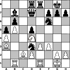 game notation in PGN-format [Event "Schachkings Miniturnier"] [Site "www.myChess.de"] [Date "2010.10.10"] [Round "1"] [White "Seneca"] [Black "Caligula"] [ECO "D30"] [WhitemyELO "1488"] [BlackmyELO "1384"] [Result "0-1"] [TimeControl "10/2592000"] [WhiteDays "27"] [BlackDays "30"] [MyChessNo "68883"] 1. d4 d5 2. c4 e6 3. e3 Nf6 4. a3 Nbd7 5. Nc3 b6 6. cxd5 exd5 7. Nf3 Bb7 8. Bd3 c5 9. O-O Be7 10. Rb1 O-O 11. b3 a6 12. a4 a5 13. Nb5 cxd4 14. Nfxd4 Nc5 15. Bc2 Ba6 16. Nc6 Qd7 17. Nxe7+ Qxe7 18. Ba3 Rad8 19. Re1 Qd7 20. Nd4 Rfe8 21. b4 Nce4 22. b5 Bb7 23. Qd3 Nc5 24. f3 Nxd3 0-1 position notation in FEN-format 3rr1k1/1b1q1ppp/1p3n2/pP1p4/P2N4/B2nPP2/2BP2PP/1R2R1K1 - - - 0 25 Captured white pieces: Captured black pieces: Click on a captured piece in order to display the desired move!