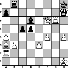 game notation in PGN-format [Event "Kleines Herbstturnier"] [Site "www.myChess.de"] [Date "2004.10.28"] [Round "1"] [White "Seneca"] [Black "Falcor"] [ECO "A47"] [WhitemyELO "1506"] [BlackmyELO "1222"] [Result "1-0"] [TimeControl "10/2592000"] [WhiteDays "120"] [BlackDays "099"] [MyChessNo "7631"] 1. d4 Nf6 2. Nf3 b6 3. e3 Bb7 4. Bd3 e6 5. O-O d5 6. Nbd2 Bd6 7. c4 Qe7 8. Qc2 Na6 9. cxd5 exd5 10. Bxa6 Bxa6 11. Qa4+ Qd7 12. Qxa6 O-O 13. Qd3 h6 14. b3 Qe6 15. Qe2 Rfe8 16. g3 Qg4 17. Kg2 Ne4 18. Nxe4 Rxe4 19. a4 h5 20. Ra2 g5 21. h3 Qf5 22. Nd2 Qg6 23. Nxe4 Qxe4+ 24. f3 Qe6 25. Ba3 c5 26. dxc5 bxc5 27. h4 gxh4 28. gxh4 Qg6+ 29. Kh1 Kh7 30. Rg1 Qf6 31. f4 Rb8 32. Qxh5+ Qh6 33. Qxf7+ Kh8 34. Rg6 Qh7 35. Qf6+ 1-0 position notation in FEN-format 1r5k/p6q/3b1QR1/2pp4/P4P1P/BP2P3/R7/7K - - - 4 35 Captured white pieces: Captured black pieces: Click on a captured piece in order to display the desired move!
