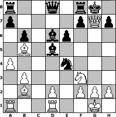 game notation in PGN-format [Event "Tigran (Wartanowitsch)Petrosjan Turnier"] [Site "www.myChess.de"] [Date "2009.08.09"] [Round "1"] [White "Ostseeboy"] [Black "martinus"] [ECO "A46"] [WhitemyELO "1262"] [BlackmyELO "1834"] [Result "1-0"] [TimeControl "10/2592000"] [WhiteDays "60"] [BlackDays "57"] [MyChessNo "58153"] 1. d4 Nf6 2. Nf3 d5 3. e3 e6 4. Be2 c5 5. O-O Nc6 6. b3 cxd4 7. exd4 Bd6 8. Bb2 O-O 9. c4 b6 10. cxd5 Nxd5 11. Nc3 Nf4 12. Bb5 Bb7 13. d5 Nb4 14. a3 Nbxd5 15. Nxd5 Nxd5 16. Qd4 Nf6 17. Rfd1 Bd5 18. a4 Ne4 19. Qxg7# 1-0 position notation in FEN-format r2q1rk1/p4pQp/1p1bp3/1B1b4/P3n3/1P3N2/1B1P1PPP/R2R2K1 - - - 0 19 Captured white pieces: Captured black pieces: Click on a captured piece in order to display the desired move!
