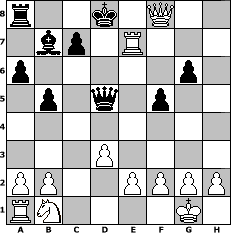 game notation in PGN-format [Event "Ostdeutschland"] [Site "www.myChess.de"] [Date "2008.08.12"] [Round "1"] [White "muellerh"] [Black "Damenmatt"] [ECO "C57"] [WhitemyELO "1519"] [BlackmyELO "1479"] [Result "1-0"] [TimeControl "10/2592000"] [WhiteDays "85"] [BlackDays "75"] [MyChessNo "47098"] 1. e4 e5 2. Nf3 Nc6 3. Bc4 Nf6 4. Ng5 a6 5. Nxf7 Qe7 6. Nxh8 b5 7. Bb3 Nd4 8. Bf7+ Kd8 9. c3 Ne6 10. O-O Bb7 11. d3 d5 12. Re1 d4 13. Bxe6 Qxe6 14. Bg5 Qg8 15. cxd4 exd4 16. Ng6 hxg6 17. e5 Be7 18. exf6 Bxf6 19. Bxf6+ gxf6 20. Qg4 f5 21. Qxd4+ Qd5 22. Qf6+ Kd7 23. Re7+ Kd8 24. Qf8# 1-0 position notation in FEN-format r2k1Q2/1bp1R3/p5p1/1p1q1p2/8/3P4/PP2PPPP/RN4K1 - - - 6 24 Captured white pieces: ![]() ![]() ![]() ![]() ![]() ![]() ![]() ![]() ![]() ![]() ![]() ![]() ![]() ![]() ![]() Captured black pieces: ![]() ![]() ![]() ![]() ![]() ![]() ![]() ![]() ![]() ![]() ![]() ![]() ![]() ![]() ![]() Click on a captured piece in order to display the desired move!