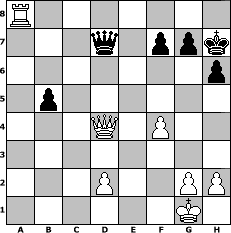 game notation in PGN-format [Event "QGD: Orthodox Verteidigung"] [Site "www.myChess.de"] [Date "2008.08.11"] [Round "1"] [White "Stoertebecker"] [Black "neve"] [ECO "D65"] [WhitemyELO "1668"] [BlackmyELO "1466"] [Result "1-0"] [TimeControl "10/2592000"] [WhiteDays "089"] [BlackDays "120"] [MyChessNo "47036"] 1. d4 d5 2. c4 e6 3. Nc3 Nf6 4. Bg5 Be7 5. e3 O-O 6. Nf3 Nbd7 7. Rc1 c6 8. Qc2 a6 9. cxd5 exd5 10. Be2 b5 11. O-O c5 12. e4 dxe4 13. Nxe4 Nxe4 14. Qxe4 Bxg5 15. Nxg5 Qxg5 16. f4 Qf6 17. Qxa8 Qxd4+ 18. Rf2 Qxb2 19. Rcf1 Qb4 20. Bg4 Qa5 21. Bxd7 Bxd7 22. Qd5 Be6 23. Qxc5 Bxa2 24. Ra1 Re8 25. Rfxa2 Qd8 26. Rxa6 h6 27. Qb4 Qd7 28. Ra8 Rxa8 29. Rxa8+ Kh7 30. Qd4 1-0 position notation in FEN-format R7/3q1ppk/7p/1p6/3Q1P2/8/3P2PP/6K1 - - - 2 30 Captured white pieces: ![]() ![]() ![]() ![]() ![]() ![]() ![]() ![]() ![]() ![]() ![]() ![]() ![]() ![]() ![]() Captured black pieces: ![]() ![]() ![]() ![]() ![]() ![]() ![]() ![]() ![]() ![]() ![]() ![]() ![]() ![]() ![]() Click on a captured piece in order to display the desired move!