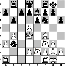 | game notation in PGN-format [Event "TM7E - E00 - Katalanische Er"] [Site "www.myChess.de"] [Date "2013.01.24"] [Round "1"] [White "Teresa"] [Black "faustballer"] [ECO "E00"] [WhitemyELO "1560"] [BlackmyELO "1552"] [Result "0-1"] [TimeControl "10/2592000"] [WhiteDays "27"] [BlackDays "30"] [MyChessNo "86251"] 1. d4 Nf6 2. c4 e6 3. g3 b6 4. Nf3 Bb7 5. Bg2 h6 6. a3 Nc6 7. Nc3 Rb8 8. O-O Be7 9. Bf4 O-O 10. d5 Na5 11. Qd3 Ba6 12. b4 Bxc4 13. Qd4 Bxe2 14. Nxe2 Nb3 0-1 position notation in FEN-format 1r1q1rk1/p1ppbpp1/1p2pn1p/3P4/1P1Q1B2/Pn3NP1/3PNPBP/R4RK1 - - - 1 15 Captured white pieces: Captured black pieces: Click on a captured piece in order to display the desired move!