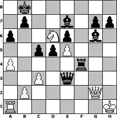 game notation in PGN-format [Event "7er"] [Site "www.myChess.de"] [Date "2010.04.18"] [Round "1"] [White "BobbyF4"] [Black "spiderman"] [ECO "B00"] [WhitemyELO "1556"] [BlackmyELO "1532"] [Result "0-1"] [TimeControl "10/2592000"] [WhiteDays "17"] [BlackDays "29"] [MyChessNo "64937"] 1. e4 Nc6 2. d4 d5 3. e5 Bf5 4. Bb5 Qd7 5. Ne2 a6 6. Bxc6 Qxc6 7. Nbc3 O-O-O 8. Ng3 Bg6 9. O-O e6 10. a4 Bb4 11. Bd2 Kb8 12. Nge2 Ne7 13. Nf4 Nf5 14. Nfe2 f6 15. g4 Nh4 16. Ng3 Qc4 17. Nce2 Nf3+ 18. Kg2 Nxd2 19. c3 Nxf1 20. Kxf1 Be7 21. Kg1 fxe5 22. dxe5 Qxg4 23. Qd2 Rhf8 24. Nd4 c5 25. f3 Qh3 26. Nb5 Rxf3 27. Nd6 Rdf8 28. Qe2 Rxg3+ 29. hxg3 Qxg3+ 30. Qg2 Qe3+ 31. Kh1 Rf4 0-1 position notation in FEN-format 1k6/1p2b1pp/p2Np1b1/2ppP3/P4r2/2P1q3/1P4Q1/R6K - - - 4 32 Captured white pieces: Captured black pieces: Click on a captured piece in order to display the desired move!