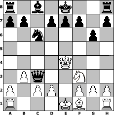 game notation in PGN-format [Event "ComeBack"] [Site "www.myChess.de"] [Date "2008.11.09"] [Round "1"] [White "Knight"] [Black "murphy12"] [ECO "A45"] [WhitemyELO "1153"] [BlackmyELO "1686"] [Result "0-1"] [TimeControl "10/1728000"] [WhiteDays "40"] [BlackDays "40"] [MyChessNo "49641"] 1. d4 Nf6 2. Nc3 c5 3. e4 cxd4 4. Qxd4 Nc6 5. Qe3 g6 6. b3 Bg7 7. Bb2 Qa5 8. Nf3 Nxe4 9. Qxe4 Bxc3+ 10. Bxc3 Qxc3+ 0-1 position notation in FEN-format r1b1k2r/pp1ppp1p/2n3p1/8/4Q3/1Pq2N2/P1PP1PPP/R3KB1R - KQkq - 0 11 Captured white pieces: ![]() ![]() ![]() ![]() ![]() ![]() ![]() ![]() ![]() ![]() ![]() ![]() ![]() ![]() ![]() Captured black pieces: ![]() ![]() ![]() ![]() ![]() ![]() ![]() ![]() ![]() ![]() ![]() ![]() ![]() ![]() ![]() Click on a captured piece in order to display the desired move!
