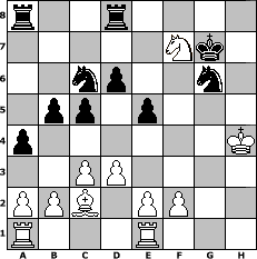 game notation in PGN-format [Event "Enkel-Cup 2014"] [Site "www.myChess.de"] [Date "2014.06.07"] [Round "1"] [White "Andylein1989"] [Black "Helmut48"] [ECO "B00"] [WhitemyELO "1539"] [BlackmyELO "1954"] [Result "0-1"] [TimeControl "10/864000"] [WhiteDays "10"] [BlackDays "10"] [MyChessNo "94639"] 1. e4 Nc6 2. Nf3 e5 3. Bc4 Bc5 4. d3 Nf6 5. c3 O-O 6. O-O Be7 7. Nbd2 a6 8. Re1 d6 9. h3 b5 10. Bb3 Bd7 11. Nf1 h6 12. Bd2 Na5 13. Bc2 c5 14. Ng3 Nc6 15. Nf5 Bxf5 16. exf5 Re8 17. Qc1 Qc8 18. g4 Qb7 19. Kg2 a5 20. Kg3 a4 21. Bxh6 gxh6 22. Qxh6 Red8 23. g5 Nh7 24. g6 Nf8 25. h4 fxg6 26. fxg6 Bf6 27. Ng5 Qg7 28. Qxg7+ Kxg7 29. Nf7 Bxh4+ 30. Kxh4 Nxg6+ 0-1 position notation in FEN-format r2r4/5Nk1/2np2n1/1pp1p3/p6K/2PP4/PPB1PP2/R3R3 - - - 0 31 Captured white pieces: Captured black pieces: Click on a captured piece in order to display the desired move!
