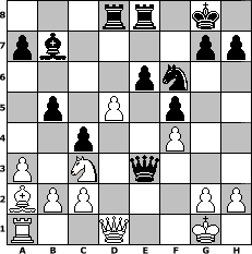 game notation in PGN-format [Event "F"] [Site "www.myChess.de"] [Date "2017.08.16"] [Round "1"] [White "Knight"] [Black "augustus"] [ECO "D00"] [WhitemyELO "1206"] [BlackmyELO "1214"] [Result "0-1"] [TimeControl "10/2592000"] [WhiteDays "90"] [BlackDays "88"] [MyChessNo "109179"] 1. d4 d5 2. e4 dxe4 3. Nc3 f5 4. f3 Nf6 5. Be3 e6 6. Bb5+ c6 7. Ba4 Bb4 8. f4 b5 9. Bb3 O-O 10. Nge2 Ng4 11. Bd2 Qb6 12. Bc1 Bb7 13. O-O Re8 14. Bd2 e3 15. Bc1 Nd7 16. Rf3 Ndf6 17. Bxe3 Rad8 18. a3 Bxc3 19. d5 c5 20. Nxc3 Nxe3 21. Rxe3 c4 22. Ba2 Qxe3+ 0-1 position notation in FEN-format 3rr1k1/pb4pp/4pn2/1p1P1p2/2p2P2/P1N1q3/BPP3PP/R2Q2K1 - - - 0 23 Captured white pieces: Captured black pieces: Click on a captured piece in order to display the desired move!