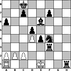 game notation in PGN-format [Event "el ajedrez"] [Site "www.myChess.de"] [Date "2006.02.04"] [Round "1"] [White "MichaelKnopf"] [Black "Schefsche"] [ECO "C60"] [WhitemyELO "1439"] [BlackmyELO "1395"] [Result "0-1"] [TimeControl "10/2592000"] [WhiteDays "29"] [BlackDays "30"] [MyChessNo "22252"] 1. e4 e5 2. Nf3 Nc6 3. Bb5 Qf6 4. O-O a6 5. Bxc6 bxc6 6. d3 d5 7. exd5 cxd5 8. Re1 Bd6 9. Bg5 Qg6 10. Bc1 Nf6 11. Nh4 Qg4 12. Qxg4 Bxg4 13. d4 e4 14. h3 Be6 15. g4 O-O-O 16. Ng2 Rdg8 17. Nd2 g5 18. Nb3 h5 19. Bxg5 Rxg5 20. Ne3 hxg4 21. h4 Rxh4 22. Nd2 Nh5 23. Nef1 g3 24. fxg3 Bxg3 25. Re2 Nf4 26. Re3 Be1+ 27. Ng3 Bxg3 28. Nf1 Be1+ 29. Rg3 Bxg3 30. Nxg3 Rxg3+ 31. Kf2 Rf3+ 32. Ke1 Rh1+ 0-1 position notation in FEN-format 2k5/2p2p2/p3b3/3p4/3Ppn2/5r2/PPP5/R3K2r - - - 4 33 Captured white pieces: ![]() ![]() ![]() ![]() ![]() ![]() ![]() ![]() ![]() ![]() ![]() ![]() ![]() ![]() ![]() Captured black pieces: ![]() ![]() ![]() ![]() ![]() ![]() ![]() ![]() ![]() ![]() ![]() ![]() ![]() ![]() ![]() Click on a captured piece in order to display the desired move!