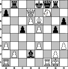 game notation in PGN-format [Event "Pott Schach - Glück Auf die xte."] [Site "www.myChess.de"] [Date "2020.11.05"] [Round "1"] [White "miu"] [Black "Haneken"] [ECO "D20"] [WhitemyELO "1520"] [BlackmyELO "1126"] [Result "1-0"] [TimeControl "10/2592000"] [WhiteDays "87"] [BlackDays "85"] [MyChessNo "119716"] 1. d4 d5 2. c4 dxc4 3. Nc3 e6 4. e4 Bb4 5. Bxc4 c6 6. Nf3 c5 7. O-O Nf6 8. e5 Ng4 9. h3 Nh6 10. Nb5 Bd7 11. Nd6+ Ke7 12. Ng5 Nf5 13. Ndxf7 Qf8 14. d5 Rg8 15. d6+ Ke8 16. Nxe6 Bxe6 17. Bxe6 h6 18. Qb3 g5 19. Be3 Nxe3 20. fxe3 Nd7 21. a3 Bd2 22. Qxb7 Rb8 23. Qxd7# 1-0 position notation in FEN-format 1r2kqr1/p2Q1N2/3PB2p/2p1P1p1/8/P3P2P/1P1b2P1/R4RK1 - - - 0 23 Captured white pieces: Captured black pieces: Click on a captured piece in order to display the desired move!