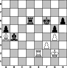 game notation in PGN-format [Event "Gary COME BACK Turnier"] [Site "www.myChess.de"] [Date "2005.03.18"] [Round "1"] [White "Joschi"] [Black "UPS"] [ECO "B20"] [WhitemyELO "1601"] [BlackmyELO "1627"] [Result "1/2-1/2"] [TimeControl "10/1728000"] [WhiteDays "19"] [BlackDays "20"] [MyChessNo "11272"] 1. e4 c5 2. g3 e5 3. Bg2 Nf6 4. Ne2 Nc6 5. c3 Be7 6. d4 cxd4 7. cxd4 exd4 8. Nxd4 Bb4+ 9. Bd2 Qa5 10. Nb3 Qe5 11. Nc3 O-O 12. O-O d6 13. a3 Bc5 14. Bf4 Qe6 15. Qc2 a6 16. Rad1 Ne5 17. Nd5 Nxd5 18. Rxd5 b6 19. Nd4 Qf6 20. Nf3 Nxf3+ 21. Bxf3 Be6 22. Rh5 Rac8 23. Qd2 Bd4 24. Bg2 Bxb2 25. Qxd6 Qd4 26. e5 Rcd8 27. Qxd4 Bxd4 28. Rb1 Rb8 29. Bg5 g6 30. Rh4 Bxe5 31. Rhb4 b5 32. Be7 Rfe8 33. Bc5 Bc4 34. Rc1 a5 35. Rbb1 Ba2 36. Ba7 Bxb1 37. Bxb8 Rxb8 38. Rxb1 Bd6 39. Bc6 b4 40. axb4 Bxb4 41. Kf1 Rd8 42. Rb2 Rd6 43. Ba4 Kg7 44. Ke2 f5 45. Kf3 Kf6 46. h3 g5 47. g4 Rd3+ 48. Kg2 fxg4 49. hxg4 Ke5 50. Re2+ Kf6 51. Bc2 Rd4 52. f3 h6 53. Bb3 Rd6 54. Ba4 1/2-1/2 position notation in FEN-format 8/8/3r1k1p/p5p1/Bb4P1/5P2/4R1K1/8 - - - 3 54 Captured white pieces: Captured black pieces: Click on a captured piece in order to display the desired move!