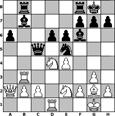 game notation in PGN-format [Event "Sommerzeit"] [Site "www.myChess.de"] [Date "2008.06.01"] [Round "2"] [White "larlinde"] [Black "dbuse"] [ECO "B40"] [WhitemyELO "2209"] [BlackmyELO "1881"] [Result "1/2-1/2"] [TimeControl "10/864000"] [WhiteDays "11"] [BlackDays "29"] [MyChessNo "45295"] 1. e4 c5 2. Nf3 e6 3. Nc3 a6 4. g3 b5 5. d4 cxd4 6. Nxd4 Bb7 7. Bg2 b4 8. Nce2 Nf6 9. Bg5 Be7 10. Qd3 d6 11. O-O Nbd7 12. a3 bxa3 13. Rxa3 O-O 14. Qe3 Rc8 15. Bxf6 Bxf6 16. Rd1 Ne5 17. Qb3 Qc7 18. Qa2 Rb8 19. Rc3 Qb6 20. Rb3 Qc5 1/2-1/2 position notation in FEN-format 1r3rk1/1b3ppp/p2ppb2/2q1n3/3NP3/1R4P1/QPP1NPBP/3R2K1 - - - 10 21 Captured white pieces: Captured black pieces: Click on a captured piece in order to display the desired move!