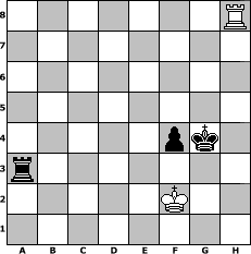 game notation in PGN-format [Event "mal spielen ohne drogen oder der k"] [Site "www.myChess.de"] [Date "2006.04.28"] [Round "1"] [White "Andreas"] [Black "nogumo"] [ECO "C43"] [WhitemyELO "1563"] [BlackmyELO "1771"] [Result "1/2-1/2"] [TimeControl "10/1728000"] [WhiteDays "160"] [BlackDays "160"] [MyChessNo "24877"] 1. e4 e5 2. Nf3 Nf6 3. d4 Nxe4 4. Bd3 d5 5. Bxe4 dxe4 6. Nxe5 Nd7 7. Bf4 Nxe5 8. dxe5 Qxd1+ 9. Kxd1 Bg4+ 10. Kc1 Bc5 11. h3 Be6 12. Nc3 Bxf2 13. Nxe4 Bb6 14. b3 O-O-O 15. Rd1 Bd5 16. Ng5 h6 17. Nf3 g5 18. Bg3 Bxf3 19. gxf3 Rxd1+ 20. Kxd1 Bd4 21. Rb1 Re8 22. f4 gxf4 23. Bxf4 h5 24. Ke2 Bxe5 25. Bxe5 Rxe5+ 26. Kf3 Kd7 27. Rd1+ Ke6 28. Kf4 Rd5 29. Re1+ Kf6 30. Re2 b5 31. h4 a5 32. a3 c5 33. Re3 b4 34. axb4 cxb4 35. c3 Rf5+ 36. Kg3 bxc3 37. Rxc3 Rb5 38. Rf3+ Ke6 39. Re3+ Re5 40. Rd3 f6 41. Rc3 Rb5 42. Rd3 Ke5 43. Kf3 Rb4 44. Kg3 Ke4 45. Rf3 f5 46. Rf4+ Ke5 47. Rf3 f4+ 48. Kf2 Kf5 49. Kg2 Kg4 50. Rh3 Rd4 51. Rc3 Rd5 52. Rc4 Rb5 53. Ra4 Rf5 54. b4 axb4 55. Rxb4 Kxh4 56. Kf3 Kg5 57. Rb2 Ra5 58. Rg2+ Kf5 59. Rg8 Ra3+ 60. Kf2 Ra6 61. Kf3 Rf6 62. Rh8 Kg6 63. Rg8+ Kh7 64. Rg1 Rf8 65. Rg2 Kh6 66. Rg1 Rf5 67. Rg8 Rf6 68. Rg2 h4 69. Rg4 h3 70. Rh4+ Kg5 71. Rxh3 Ra6 72. Rh8 Ra3+ 73. Kf2 Kg4 1/2-1/2 position notation in FEN-format 7R/8/8/8/5pk1/r7/5K2/8 - - - 5 74 Captured white pieces: Captured black pieces: Click on a captured piece in order to display the desired move!