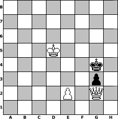 game notation in PGN-format [Event "Open II"] [Site "www.myChess.de"] [Date "2016.03.11"] [Round "1"] [White "miu"] [Black "Joschi"] [ECO "B13"] [WhitemyELO "1616"] [BlackmyELO "1512"] [Result "1-0"] [TimeControl "10/1728000"] [WhiteDays "138"] [BlackDays "140"] [MyChessNo "102867"] 1. e4 c6 2. d4 d5 3. exd5 cxd5 4. Bf4 Nc6 5. Bb5 Nf6 6. Nf3 e6 7. O-O Bd6 8. Bg5 Be7 9. Ne5 Qb6 10. a4 a6 11. Bxc6+ bxc6 12. Ra2 O-O 13. c3 c5 14. a5 Qc7 15. Re1 cxd4 16. cxd4 Bb7 17. Nd2 h6 18. Bf4 Bd6 19. Ndf3 Rfb8 20. Re3 Ne4 21. Nd2 Nxd2 22. Qxd2 f6 23. Rc3 Qd8 24. Nd3 Bxf4 25. Qxf4 Rc8 26. Nc5 Qe7 27. Ra1 Bc6 28. Re1 Re8 29. Rxe6 Qxe6 30. Nxe6 Rxe6 31. Re3 Rae8 32. Kf1 Bb5+ 33. Ke1 g5 34. Qf3 Bc4 35. Kd2 Kg7 36. b3 Bb5 37. Qxd5 Kf7 38. Qf3 Bc6 39. d5 Rd6 40. Rxe8 Rxd5+ 41. Qxd5+ Bxd5 42. Rb8 Bxg2 43. Kd3 Bf1+ 44. Kd4 f5 45. b4 Kg6 46. Kc5 g4 47. b5 axb5 48. a6 b4 49. a7 Bg2 50. Kxb4 h5 51. Kb5 Kg5 52. Kb6 Kf4 53. Rb7 Bxb7 54. Kxb7 Kf3 55. a8=Q Kxf2 56. Qf8 Kg2 57. Qxf5 Kxh2 58. Qxh5+ Kg3 59. Kc6 Kf4 60. Qh2+ g3 61. Qg2 Kg4 62. Kd5 1-0 position notation in FEN-format 8/8/8/3K4/6k1/6p1/4P1Q1/8 - - - 3 62 Captured white pieces: Captured black pieces: Click on a captured piece in order to display the desired move!