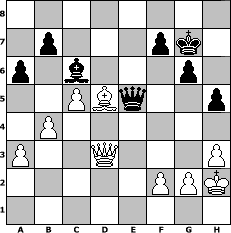 game notation in PGN-format [Event "Die Weinprobe Preis 1. Kiste guter Wein"] [Site "www.myChess.de"] [Date "2015.08.08"] [Round "1"] [White "Naunhofer"] [Black "Robert"] [ECO "D90"] [WhitemyELO "1597"] [BlackmyELO "1620"] [Result "0-1"] [TimeControl "10/2592000"] [WhiteDays "120"] [BlackDays "027"] [MyChessNo "100016"] 1. d4 Nf6 2. c4 g6 3. Nc3 d5 4. Nf3 c5 5. e3 Bg7 6. Be2 O-O 7. O-O cxd4 8. exd4 Nc6 9. Be3 a6 10. c5 Qc7 11. Rc1 Bd7 12. a3 Rad8 13. b4 e5 14. dxe5 Nxe5 15. Nxe5 Qxe5 16. Bf3 Bc6 17. Bd4 Qf5 18. Re1 Ne4 19. Bxg7 Kxg7 20. Qd4+ Kg8 21. Bd1 Nxc3 22. Rxc3 Rde8 23. Rce3 Rxe3 24. Rxe3 Re8 25. Rxe8+ Bxe8 26. h3 Bc6 27. Bf3 h5 28. Qd2 Qe5 29. Qe3 Qf6 30. Qd3 Kg7 31. Bxd5 Qa1+ 32. Kh2 Qe5+ 0-1 position notation in FEN-format 8/1p3pk1/p1b3p1/2PBq2p/1P6/P2Q3P/5PPK/8 - - - 3 33 Captured white pieces: Captured black pieces: Click on a captured piece in order to display the desired move!