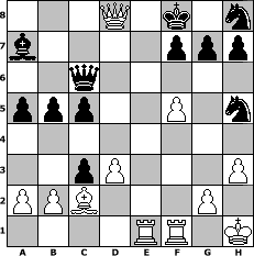 game notation in PGN-format [Event "1. Chess960/6"] [Site "www.myChess.de"] [Date "2007.03.01"] [Round "1"] [White "mcdean@"] [Black "Ostseeboy"] [Variant "Fischerrandom"] [SetUp "1"] [FEN "rbqkbrnn/pppppppp/8/8/8/8/PPPPPPPP/RBQKBRNN w KQkq - 0 1"] [WhitemyELO "1500"] [BlackmyELO "1500"] [Result "1-0"] [TimeControl "10/3456000"] [WhiteDays "106"] [BlackDays "119"] [MyChessNo "33173"] 1. c3 Nf6 2. h3 d6 3. e4 Bd7 4. f4 O-O 5. f5 e6 6. Bh4 Ne8 7. Be7 exf5 8. Bxf8 Kxf8 9. exf5 Nf6 10. Bd3 b6 11. Qc2 Qb7 12. Nf3 a5 13. Ng3 Ba7 14. O-O Re8 15. Rae1 b5+ 16. Kh1 Rd8 17. Qc1 c5 18. Bc2 Bc6 19. d3 d5 20. Ne5 d4 21. Nxc6 Qxc6 22. Qg5 dxc3 23. Nh5 Nxh5 24. Qxd8+ 1-0 position notation in FEN-format 3Q1k1n/b4ppp/2q5/ppp2P1n/8/2pP3P/PPB3P1/4RR1K - - - 0 24 Captured white pieces: Captured black pieces: Click on a captured piece in order to display the desired move!
